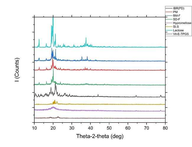 Fig. 9: (B) Overlay of XRD of Drug (PD black-line IBR); PM (red line-Physical mixture, BM-F NS (Ball mill formulation blue line-Nanosuspension); SD-F (spray dried formulation Green-line); Lactose (light purple-line); SLS (dark yellow-line); Hypromellose (Light blue-line) and Vit E TPGS (dark purple-line)