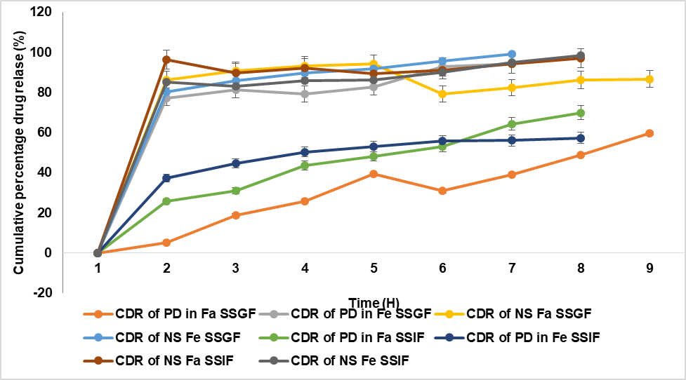 In dissolution investigation, biorelevant fluids were employed to achieve a precise approximation of in vivo function. Drug release tests were carried out in media containing Fed State Simulated Gastric Fluid (FeSSGF), Fed State Simulated Gastric Fluid (FeSSIF), Fasted State Simulated Gastric Fluid (FaSSGF), and Fed State Simulated Intestinal Fluid (FeSSIF). A USP type II equipment was used to perform the dissolving tests for both the pure medication and the improved formulation (Model DS 1400, Lab India, Mumbai), (SD-F, equivalent to 100 mg). 250 ml of dissolving media were used for each sample, and the experiment was run at 37±0.5 °C and 50 revolutions per minute. Three-milliliter aliquots were taken out and replaced with new dissolution media at predetermined intervals. After passing the samples through nylon membrane syringe filters (Sigma-Aldrich, 0.1 µm in size), the drug concentration was determined at 248 nm using a UV-visible spectrophotometer. A comparison was made of the percentage of drug released between the pure drug and the NS. To ensure uniformity, the study was conducted three times [27].