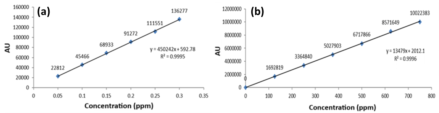 The sensitivity of the analytical method was assessed by analysing the LOD and LOQ using the established method. LOD represents the lowest concentration on the calibration curve with a signal-to-noise ratio (S/N) of ≥3, while LOQ is the minimum concentration producing an S/N of ≥10 with a %RSD (n=3) exceeding 10%. LOD was identified as the smallest detectable concentration, whereas LOQ was the concentration that allowed accurate and precise quantification. Both LOD and LOQ were determined by performing triplicate analyses.