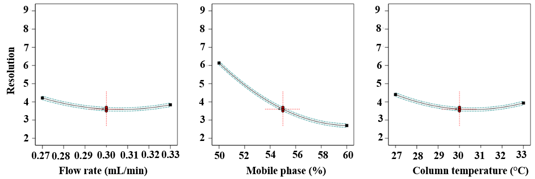 In a QbD paradigm, the analytical target profile (ATP) serves as a framework for method development, akin to the quality target product profile (QTPP) in pharmaceutical formulation. ATP outlines the desired characteristics of CAAs based on the method’s future use and regulatory criteria. It indicates essential parameters, including analyte identification, target concentration range, and technique specifications. Analytical method performance is governed by critical method parameters (CMPs), which influence CAAs through a cause-and-effect interplay with critical quality attributes (CQAs) [28]. Three fundamental CMPs that dictate the UPLC method performance include flow rate, mobile phase composition, and column oven temperature. Column ageing, for instance, may impact tailing factors and plate numbers, affecting the resolution of analytes (CAA). In this experimental design, retention time (RT), resolution, theoretical plates, and tailing factor were identified as CAAs (table 4). A central composite design was implemented to assess these factors at three levels using design software. Three-dimensional (3D) response surface plots were generated to visualise the influence of independent variables. A risk assessment analysis was conducted to identify critical variables impacting the ATP, and the optimisation results are summarised in table 2. Significant variations were observed in the responses. Table 2 presents the dependent variables alongside their expected and actual R² values, demonstrating good agreement. The robustness of the model was further supported by an adjusted R² value, with discrepancies limited to ≤0.2, confirming a strong correlation between experimental data and the predictive model. A polynomial regression equation was employed to describe the relationship between independent and dependent variables. The model’s adequate precision, which measures the signal-to-noise (S/N) ratio, was found to exceed 4, establishing its suitability for defining the analytical design space.