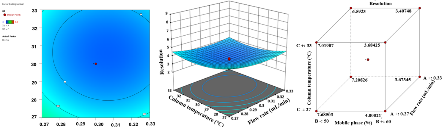 The central composite design, a variant of the DoE software (version 11.0), was used to optimize the UPLC method by incorporating both independent and dependent variables. In this research, three independent variables were selected: flow rate (A), mobile phase composition (B), and column oven temperature (C) (table 1). The selection of flow rate, mobile phase composition, and column temperature as independent variables is based on their significant impact on chromatographic performance. Mobile phase composition directly affects analyte retention and resolution; flow rate influences retention time, peak shape, and system pressure; while column temperature alters analyte-stationary phase interactions, improving peak symmetry and reproducibility. Together, these variables allow fine-tuning of separation efficiency, run time, and method robustness during optimisation. The dependent variables for HYAL and ATEZ included retention times (RT), resolution, theoretical plates, and tailing factor. Various interaction effects, quadratic effects, and polynomial calculations were employed to evaluate the results of 20 experimental runs, as illustrated in table 2. Data regarding method validation, polynomial equations, and coefficients are provided in the Results and Discussion Section. Response surface methodology was employed to assess the relationships among the variables, while analysis of variance (ANOVA) was conducted to validate the model’s significance. The range for the dependent parameters was set as follows: flow rate between 0.27 and 0.33 ml/min, mobile phase composition between 50% and 60%, and column temperature between 27 °C and 33 °C, as outlined in table 1.
