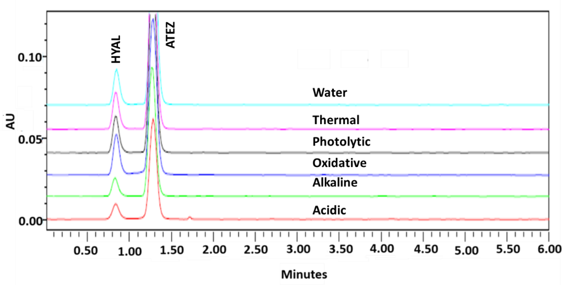 Forced degradation studies were conducted to evaluate the stability of HYAL and ATEZ under various stress conditions including oxidation with 20% H₂O₂ at 60 °C for 30 min, acid degradation with 2N HCl under reflux at 60 °C for 30 min, alkaline degradation with 2N NaOH at 60 °C for 30 min, dry heat exposure at 105 °C for six hours, photolytic degradation by UV light (200 Wh/m²) exposure for seven days, and neutral degradation by water reflux at 60 °C for six hourswith all samples subsequently diluted to specified concentrations and analyzed via UPLC to assess chromatographic stability.