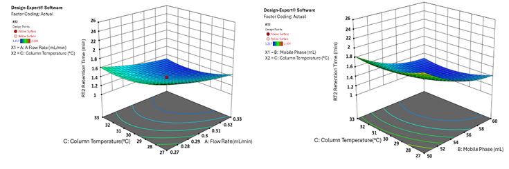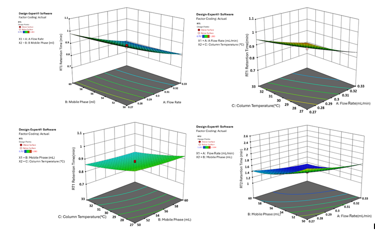 Fig. 3: 3D surface plot illustrating the effect of factor combinations on the retention time of HYAL and ATEZ using CCD