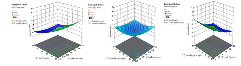 Fig. 4: 3D surface plot illustrating the effect of factor combinations on the resolution between HYAL and ATEZ using CCD
