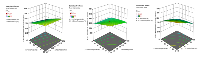 Fig. 5: 3D surface plot depicting the effect of factor combinations on the theoretical plate count of HYAL using CCD