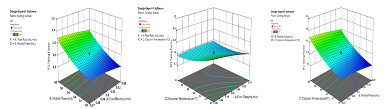 Fig. 6: 3D surface plot demonstrating the effect of factor combinations on the tailing factor (peak asymmetry) of ATEZ using CCD