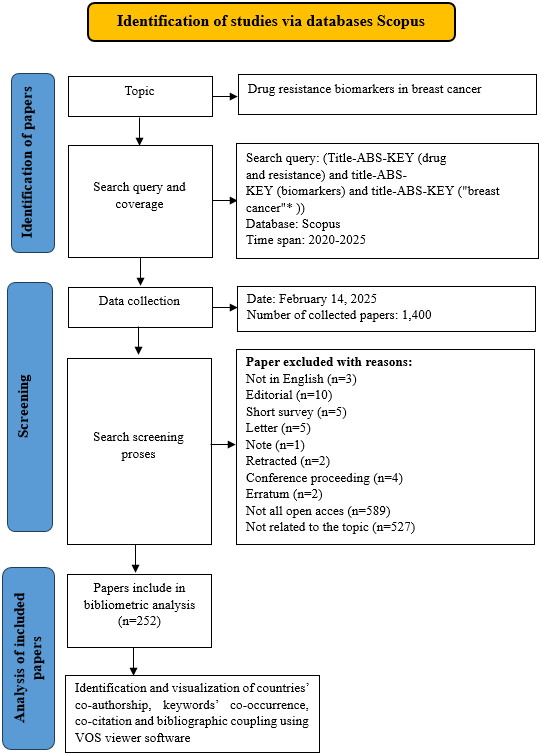 Fig. 1: PRISMA flow diagram of the exclusion and inclusion of literature. The overall workflow of the study includes two main stages: an initial Scopus search for papers produced between 2020 to 2025 related to resistance biomarkers in breast cancer, followed by a screening stage, and finally, bibliometric analysis in VOSviewer. Adapted from references [12, 20]