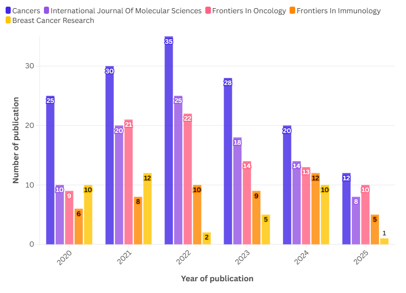 The number of publications on drug resistance biomarkers in breast cancer has fluctuated over the years, from 2020 to 2025 (fig. 2).. A notable increase in research interest was observed in 2022, when the highest number of publications was recorded, totaling 35 papers. This surge can be attributed to heightened global awareness and funding opportunities following the Coronavirus Disease 2019 (COVID-19) pandemic, which prompted increased collaborative research efforts and policy-driven scientific investments. Notably, 2022 coincided with international campaigns such as Breast Cancer Awareness Month initiatives, renewed commitments by the World Health Organization’s Global Breast Cancer Initiative (GBCI), and several large-scale funding calls from cancer research foundations targeting post-pandemic innovation in diagnostics and personalized medicine. These developments likely created a fertile environment for research on drug resistance biomarkers to flourish. After 2022, the number of publications began to decline. This drop may reflect a natural saturation point in specific research niches, a shift in scientific focus toward other subtypes of cancer or mechanisms of resistance, or the redirection of funding to more translational or clinical implementation projects. Additionally, the tapering of emergency pandemic-related funding and prioritization may have contributed to the observed decline. Across journals, Cancers (blue line) led in publication volume, peaking in 2022 before a notable reduction in subsequent years.
