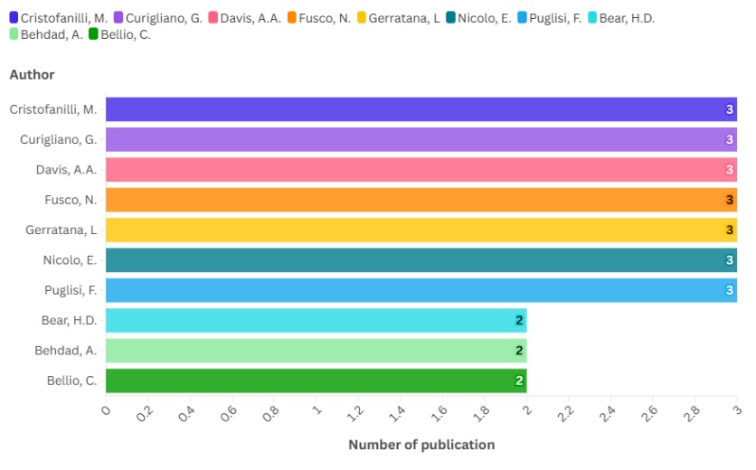 From an authorial perspective, the results reveal that the top 10 authors are responsible for a significant portion of the scientific contributions related to drug resistance biomarkers in breast cancer (fig. 4). Among them, Cristofanilli, M. (3 documents, 38 citations), Curigliano, G. (3 documents, 223 citations), Davis, A. A. (3 documents, 54 citations), Fusco, N. (3 documents, 150 citations), Gerratana, L. (3 documents, 38 citations), Nicolo, E. (3 documents, 30 citations), Puglisi, F. (3 documents, 38 citations), Bear, H. D. (2 documents, 219 citations), Behdad, A. (2 documents, 38 citations), and Bellio, C. (2 documents, 14 citations) have played a key role in advancing knowledge through their extensive publication records.