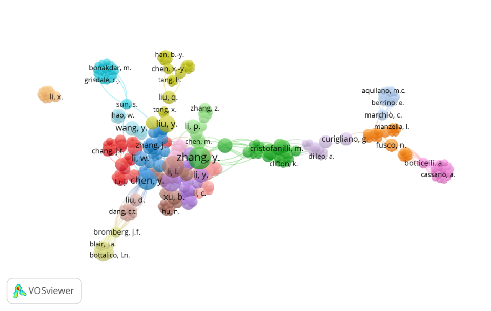 Notably, certain authors such as Zhang Y., Chen M., and Liu Y. appear as central figures, forming the largest and most interconnected clusters. Their strong bibliographic coupling suggests that their work serves as a foundation for multiple studies in this domain. The green cluster, including Cristofanilli M. and Clifton K., represents another influential group contributing to breast cancer research. Additionally, the rightmost portion of the network highlights authors such as Aquliano M. C. and Botticelli A., who form a separate but still connected research subgroup. This network analysis highlights the importance of collaboration in advancing cancer research. Researchers frequently co-author studies, share methodologies, and build upon each other’s findings.
