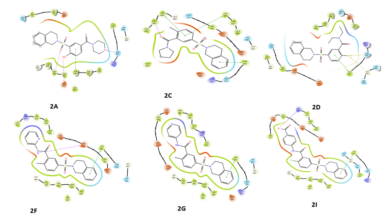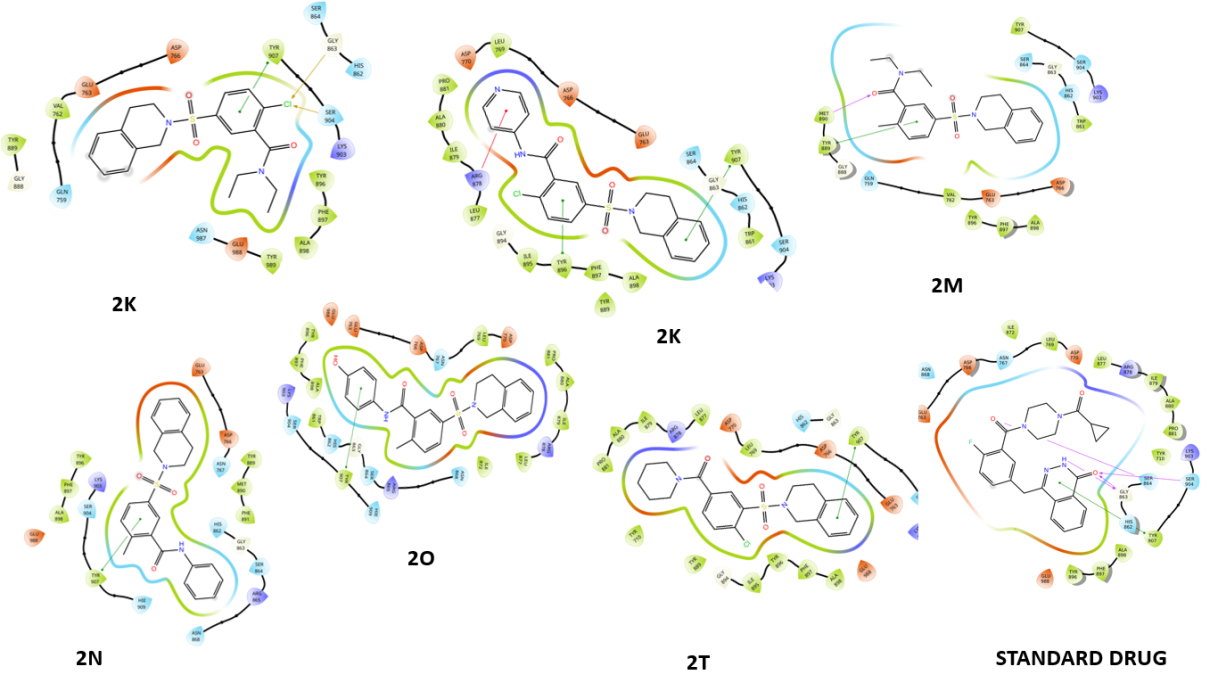 Docking analysis demonstrated that all compounds exhibited favorable binding activity, with some showing superior activity compared to Olaparib. Notably, compounds 2D, 2K, and 2M achieved the highest Glide scores of -6.53 kcal/mol,-5.94 kcal/mol, and -5.93 kcal/mol, respectively, indicating strong binding affinity. Although compounds 2O and 2N had slightly lower Glide scores of -5.85 kcal/mol and -5.68 kcal/mol than 2D, 2K, and 2M, they still exhibited significant binding potential.