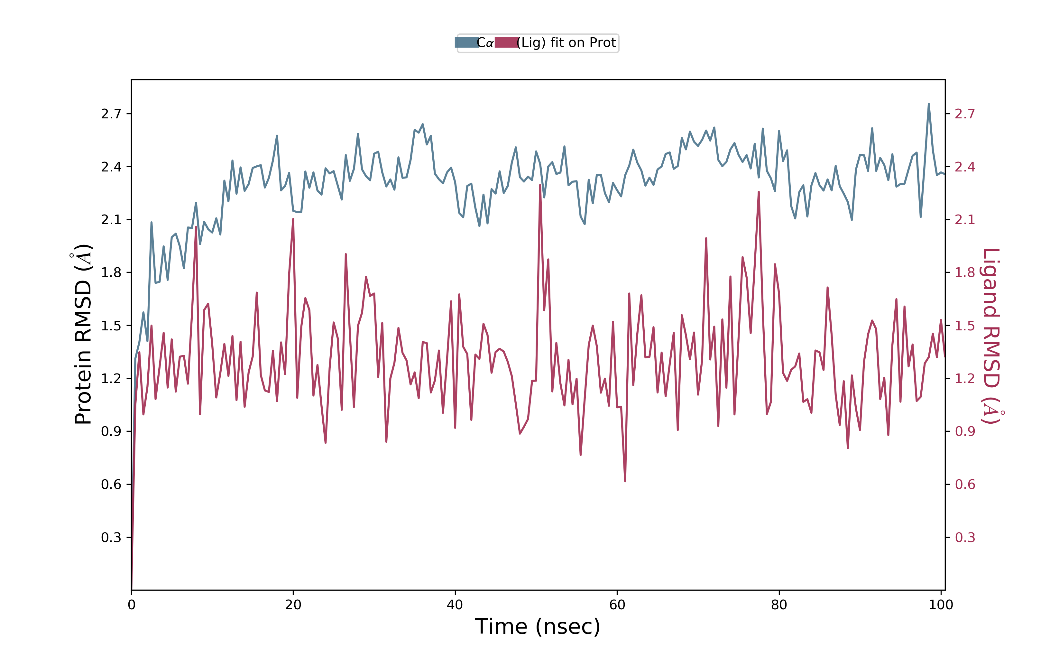 Molecular dynamics (MD) simulations were performed using the Desmond module in Schrödinger. The simulations employed the simple point-charge (SPC) explicit water model, ensuring a minimum spacing of 10 Å between the protein surface and the solvent boundary. An orthorhombic simulation box was constructed to encapsulate the system. Protein-ligand docked complexes were solvated using the orthorhombic SPC water model [34]. The solvated system was neutralized with counter ions, maintaining a physiological salt concentration of 0.15 M. The OPLS3 force field [35] was applied to describe the receptor-ligand complex. The MD simulation was conducted using the NPT ensemble (Isothermal-Isobaric ensemble), which maintains constant pressure, temperature, and particle number [36]. The simulation was executed for 100 ns under a temperature of 300 K and an atmospheric pressure of 1.013 bar, with relaxation parameters set accordingly. The system, comprising 49,339 atoms and 14,079 water molecules, was subjected to MD simulation for 100 ns. To assess the stability of the complex during the simulation, the protein backbone structures were aligned with the initial frame's backbone. The simulated interaction trajectory was analyzed by incorporating the _out. selecting Root mean Square Deviation (RMSD) and Root mean Square Fluctuation (RMSF) for evaluation. RMSD and RMSF plots were generated to illustrate the system’s stability over the simulation period.
