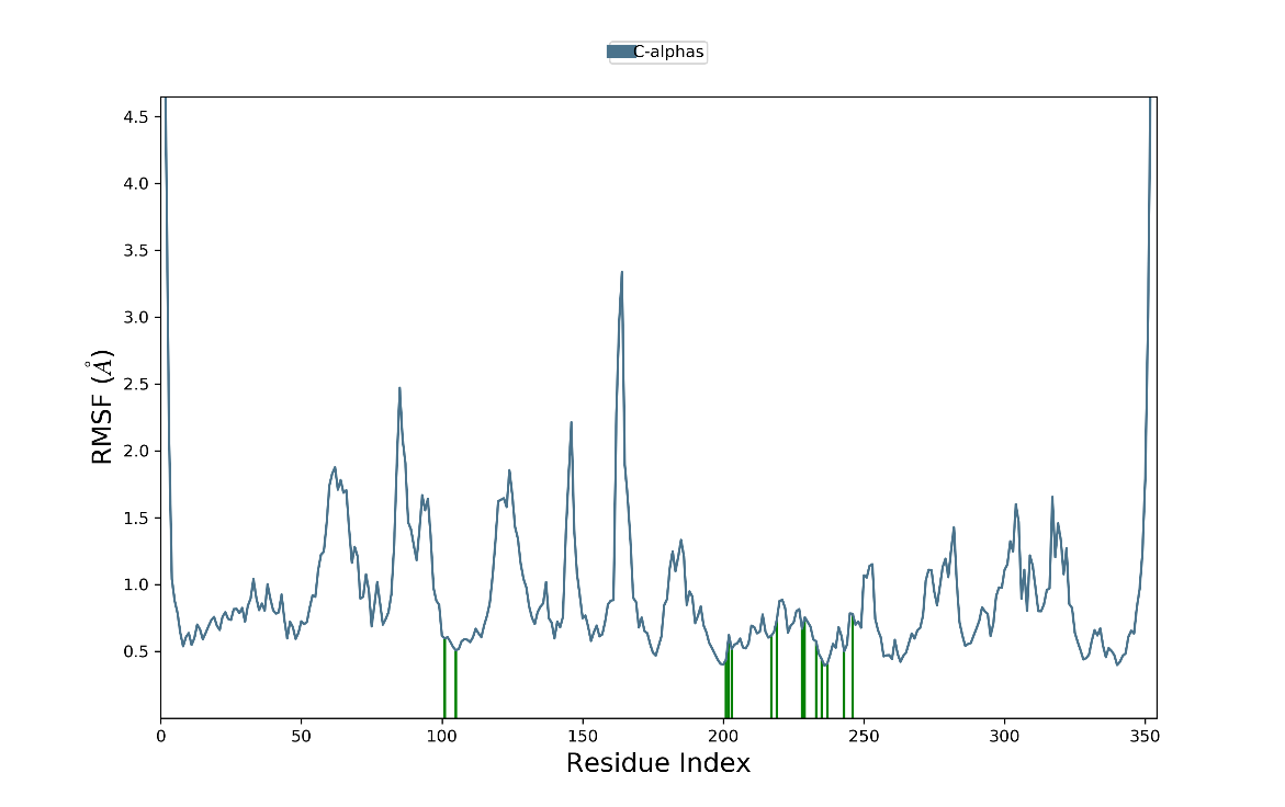 The RMSF analysis revealed minimal fluctuations throughout the simulation. As depicted in fig. 4, the Cα atoms initially exhibited variations between 0.5 and 0.9 Å, maintaining stability throughout the simulation. Notable adjustments in ligand interactions with amino acid residues were observed, though these variations remained minor, particularly between 100 ns and 200 to 250 ns. During these intervals, the RMSF values for the amino acids ranged from 0.5 to 0.6 Å and 0.6 to 0.9 Å, respectively. Overall, the protein-ligand complex remained fully stable, demonstrating a well-maintained interaction.