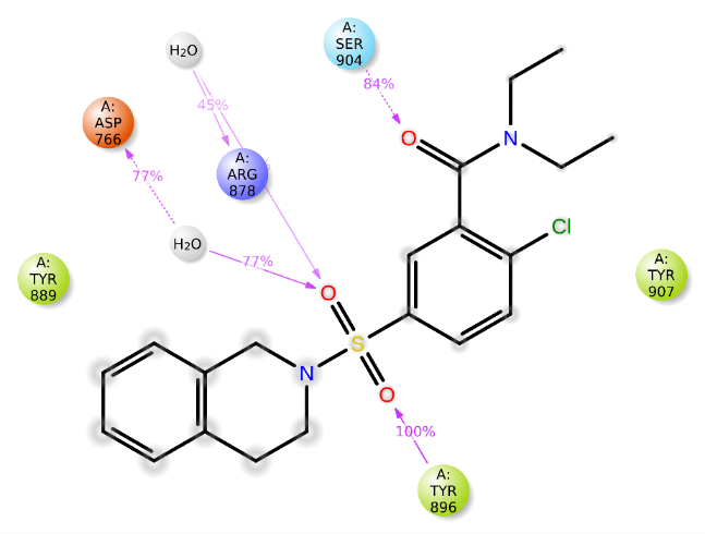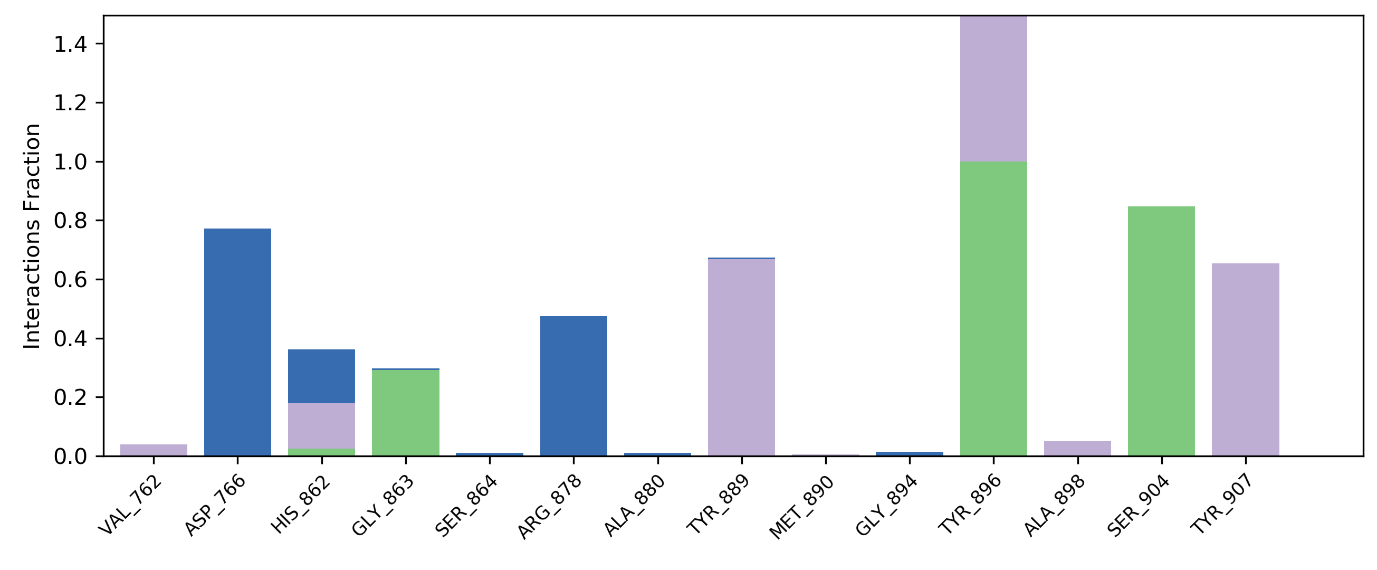 As illustrated in fig. 5, the ligand consistently interacts with amino acids through various bond types, including hydrophobic, hydrogen, and water bridge interactions. The ligand formed water bridge bonds with Asp766 and Arg878, maintaining these interactions at 0.8% out of 1.4%. Additionally, hydrophobic interactions were observed with Val762, Tyr889, Ala898, and Tyr907, with a stability of 0.7% out of 1.4%. Hydrogen bonds were established with Gly863 and Ser904, maintaining an interaction rate of 0.9% out of 1.4%. Moreover, the ligand exhibited multiple interactions with His862 and Tyr896, sustaining these bonds at a complete 1.4%, highlighting its strong binding affinity.