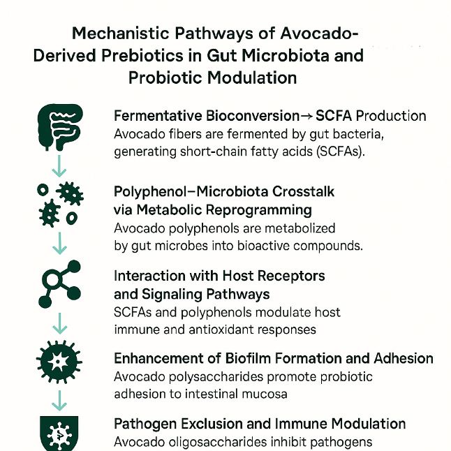 Probiotics play a crucial role in maintaining gut health, immune function, and overall well-being. However, one of the key challenges in probiotic-based formulations is their stability during storage, processing, and digestion. Prebiotics, which serve as non-digestible food components that promote the growth of beneficial microorganisms, have been increasingly studied for their potential to enhance probiotic viability [24]. Avocado-derived prebiotics, rich in dietary fibers, polyphenols, and oligosaccharides, offer a novel approach to improving the stability and functionality of probiotics. The unique polysaccharide composition and antioxidant properties of avocado-derived prebiotics help protect probiotics from environmental stressors while promoting their growth in the gut [25, 26].