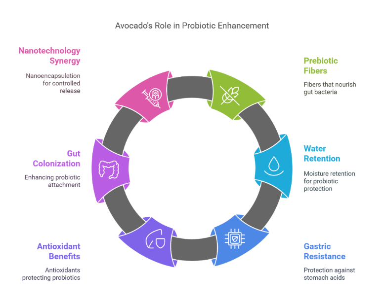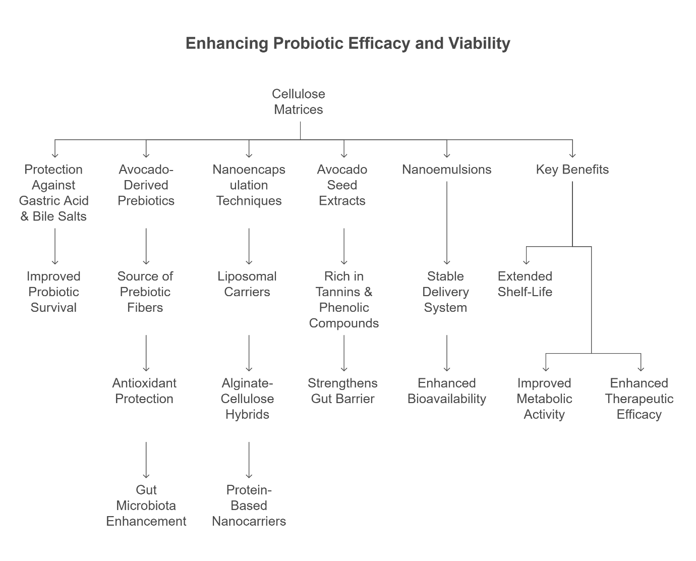 The synergistic combination of avocado-derived prebiotics, cellulose matrices, and advanced nanotechnology offers a groundbreaking approach to enhancing probiotic stability, bioavailability, and targeted delivery [70, 71]. Cellulose matrices act as biodegradable carriers, protecting probiotics from gastric acid, bile salts, and oxidative stress, while avocado-derived prebiotic fibers (oligosaccharides and polysaccharides) improve water retention, creating an optimal environment for probiotic survival. Additionally, avocado polyphenols provide antioxidant protection, preventing oxidative damage and enhancing gut microbiota diversity. When combined with nanoencapsulation techniques such as liposomal carriers, alginate-cellulose hybrids, and protein-based nanocarriers, probiotics gain enhanced resistance to environmental factors and controlled release mechanisms for effective gut colonization. Furthermore, avocado seed extracts rich in tannins and phenolic compounds contribute to gut barrier protection, while nanoemulsions ensure uniform probiotic dispersal. This multi-layered probiotic delivery system not only extends shelf-life but also optimizes metabolic activity and therapeutic efficacy, paving the way for next-generation probiotic formulations with enhanced functional and health benefits [72].