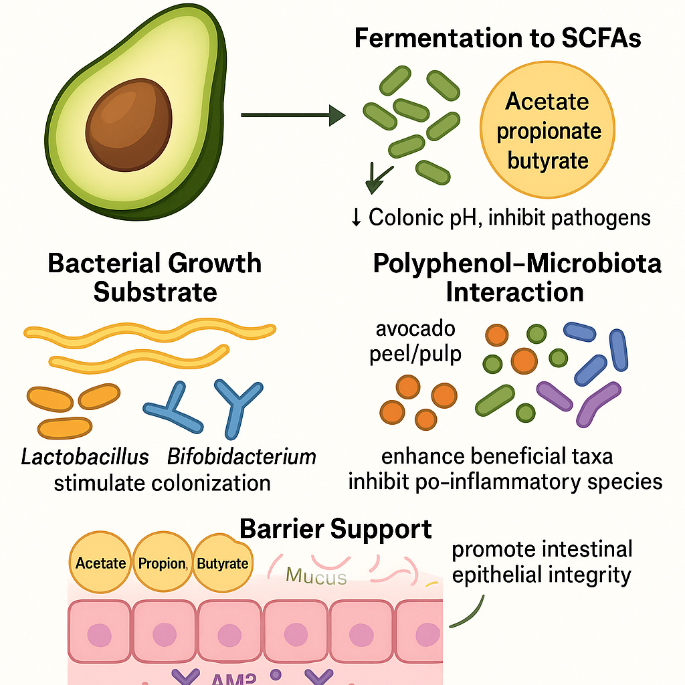 Avocado seed contains up to 58.4% dietary fiber, including complex carbohydrates that resist digestion but ferment in the colon, producing beneficial Short-Chain Fatty Acids (SCFAs) like acetate and butyrate. Avocado peel and pulp are rich in polyphenolic compounds that possess antimicrobial and antioxidant properties, potentially enhancing probiotic viability under stress. As a sustainable by-product of the food industry, avocado waste (seed, peel) offers a low-cost, eco-friendly source of functional prebiotics, reducing agricultural waste [27].