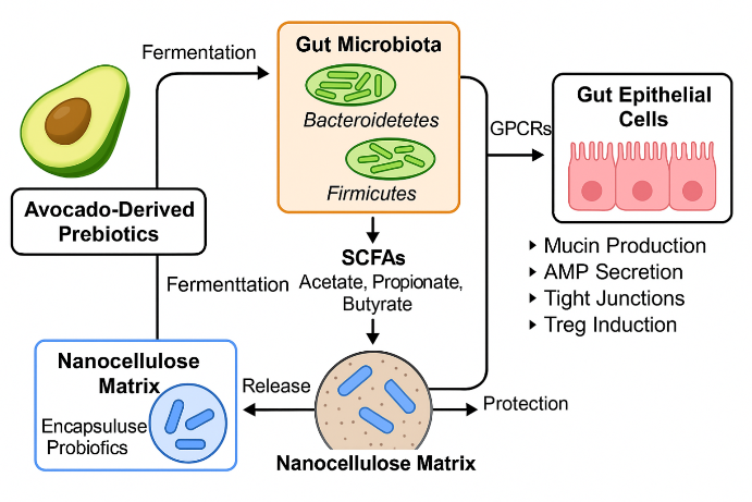 Nanotechnology, particularly nanoencapsulation strategies, has already been widely explored for enhancing the bioavailability and targeted delivery of nutraceuticals [26, 30]. Integrating avocado-derived prebiotics with cellulose-based matrices provides a sustainable, biocompatible, and effective means of ensuring probiotic protection. The synergy between nanotechnology and prebiotic carriers represents a promising avenue for delivering stable, bioavailable, and highly effective probiotic formulations in functional foods and nutraceuticals [31].