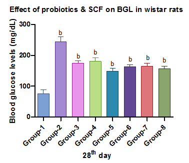 Fig. 1: Effect of probiotics and SCFAs on BGL, Each value represents mean ±SD with n=6. Data were analyzed using ANOVA, followed by Dunnett's multiple comparison test. Positive control was compared with other groups: b indicates p<0.001