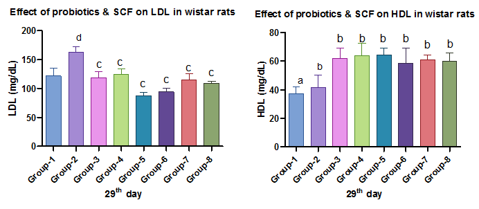 Fig. 4 and 5: Effect of Probiotics and SCFAs on LDL and HDL, Each value represents mean ±SD, with n= 6. Data were analyzed by using ANOVA followed by Dunnett's multiple comparison tests. Positive control was compared with other groups: a represents p<0.0001, b indicatesp<0.001, c indicates p<0.01, d indicates p<0.05
