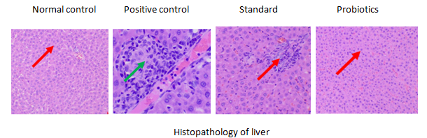 Liver histology in the positive control group showed hepatocellular swelling and leukocyte infiltration (fig. 14, green arrow). In contrast, SCFAs-probiotic treatment preserved standard liver architecture with intact hepatocyte morphology (fig. 15, red arrow).