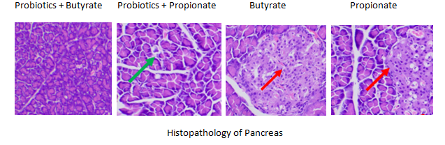 Histopathological analysis revealed severe liver and pancreatic damage in diabetic rats, including hepatocellular necrosis and beta-cell destruction, consistent with oxidative stress and inflammation induced by chronic hyperglycemia. Treatment with SCFAs and probiotics significantly preserved hepatic and pancreatic architecture, reduced inflammation, and enhanced beta-cell integrity. The combination therapy showed near-complete restoration of pancreatic tissue, likely through anti-inflammatory actions, HDAC inhibition, and gut microbiota modulation. These findings highlight the potential of SCFAs and probiotics to protect against diabetes-induced tissue damage and support metabolic homeostasis.