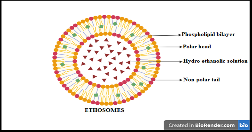 Skin is the body's largest organ, which regulates the body's temperature and protects against germs. Skin comprises minerals, fat, protein, water, and other essential nutrients [1]. The skin is composed of three layers: the Epidermis, the top layer of skin, which helps in forming new skin; it also serves as a protective barrier and provides skin color. The middle layer, the Dermis layer, helps in hair growth. It has collagen and elastin, helps in feelings and sensations, produces sweat, and supplies blood to the body. The bottom layer of skin is known as the Hypodermis layer. This layer helps regulate body temperature, helps to connect nerves and blood vessels, and has connective tissues [2]. The skin's main job is to act as a protective agent and prevent harmful substances from entering the body. Various barriers are present in the skin, which make it difficult for medication to reach the site of action. The stratum corneum is the most significant barrier. It is a foremost barrier that decreases drug permeability and decreases the therapeutic effect of bioactive components of the drug [3]. Medication in the form of creams and gels was used in the layer of skin to get therapeutic results, but now novel drugs are being used to achieve better results. One of these is ethosomes. The significant drawbacks of the conventional drug delivery system (CDDS) were an uncontrolled release of drugs, unregulated doses of drugs, and they had low bioavailability, lower efficacy, and sometimes toxicity was observed. Transdermal drug delivery system (TDDS), or a novel drug delivery system (NDDS), was introduced to overcome these drawbacks. As this drug delivery system is highly advanced, it avoids first-pass metabolism, reduces toxicity, directly reaches the systemic circulation, enhances permeation of the drug, they are highly stable, and has several benefits over conventional drug delivery systems [4].