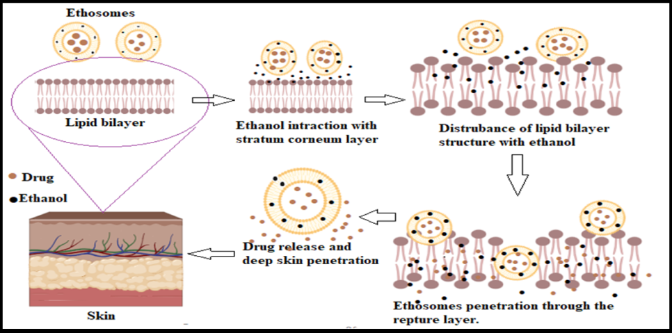 Ethosomes utilize a high ethanol concentration to enhance transdermal drug delivery. Ethanol disrupts the stratum corneum's lipid organization by reducing lipid packing density, weakening van der Waals forces, and breaking hydrogen bonds between ceramides, fatty acids, and cholesterol. This increase in membrane fluidity lowers the phase transition temperature and makes the lipid bilayer more permeable. The altered lipid structure allows ethosomes to penetrate deeper into the skin and efficiently deliver hydrophilic and lipophilic drugs, significantly improving therapeutic efficacy as shown in fig. 3 [19, 20].