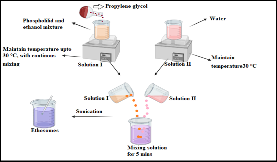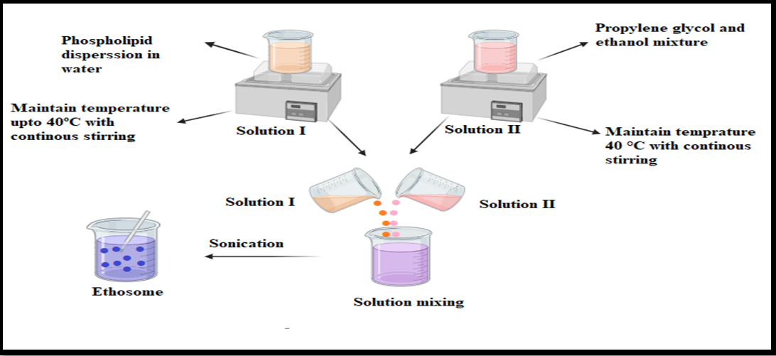 This process involves heating the phospholipid at 40 °C in a water bath to form a colloidal solution. Meanwhile, ethanol and propylene glycol are heated to 40 °C in a separate vessel. Once both solutions reach the same temperature, they are combined to form ethosomes, ensuring efficient drug encapsulation depending on its hydrophilic or lipophilic nature. Vesicle size reduction can be achieved using sonication, as shown in fig. 5 [27]. This highly scalable method has low production costs and higher encapsulation efficiency, making it ideal for lipophilic drugs. However, due to thermal exposure, it may not be suitable for heat-sensitive compounds.
