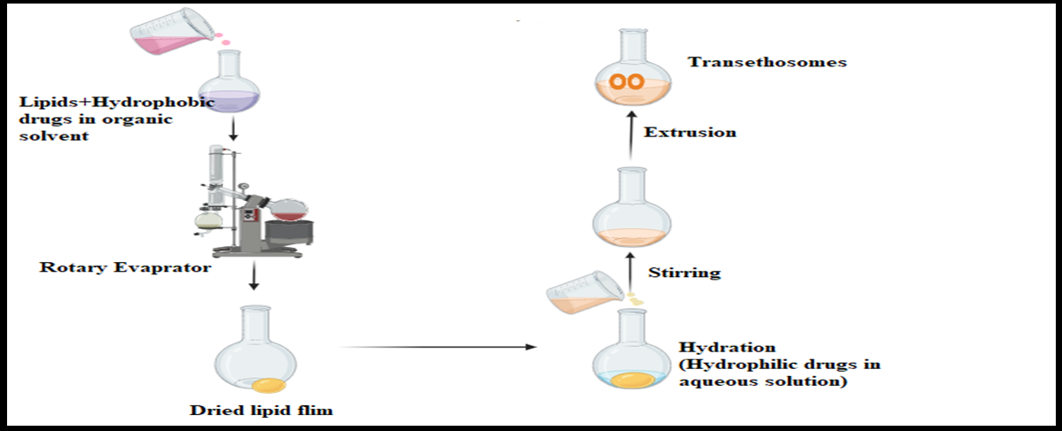 Lipids and an organic solvent are dissolved in a round-bottom flask, followed by evaporation using a rotary evaporator above the lipid transition temperature. This process creates a thin lipid film along the flask’s inner walls, then hydrated with an ethanolic mixture. The final ethosomal suspension is obtained through sonication, improving uniformity, as shown in fig. 6 [28]. This highly scalable method allows for precise control over vesicle size, making it suitable for hydrophilic and lipophilic drugs. However, it requires specialized equipment like rotary evaporators, which may increase production costs.
