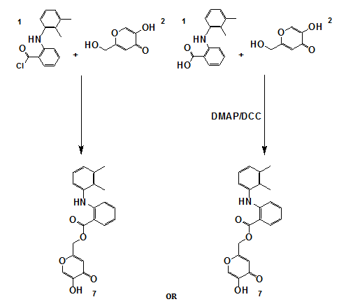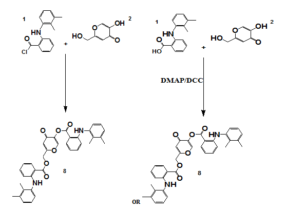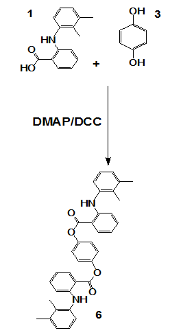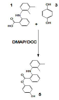 Scheme 5 represents a general Steglich esterification, where mefenamic acid or hydroquinone derivatives were coupled with cinnamic acid analogs using dicyclohexylcarbodiimide (DCC) as the coupling agent and 4-dimethylaminopyridine (DMAP) as the nucleophilic catalyst. This method was chosen for its mild conditions and compatibility with sensitive functional groups.