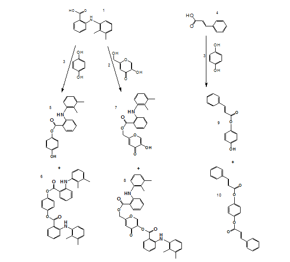 The target compounds were synthesized via esterification involving mefenamic acid and/or hydroquinone, utilizing DCC as a coupling reagent and DMAP as a nucleophilic catalyst. Initially, carboxylic acid was dissolved in dichloromethane, followed by the gradual addition of DCC under continuous stirring and cooling. Hydroquinone and/or kojic acid were subsequently introduced into the reaction mixture, which was allowed to stir at room temperature for 18 h. Upon completion, the resulting dicyclohexylurea precipitate was removed via filtration. The organic layer was sequentially washed with 1M hydrochloric acid and neutralized with sodium bicarbonate. The product was extracted, dried over magnesium sulfate, and purified through thin-layer chromatography (TLC). The specific synthetic schemes are illustrated in scheme 5.
