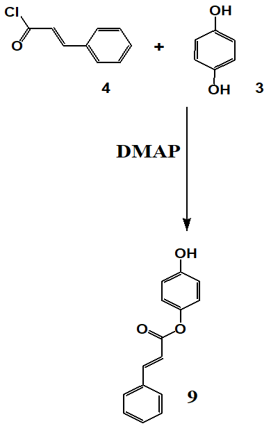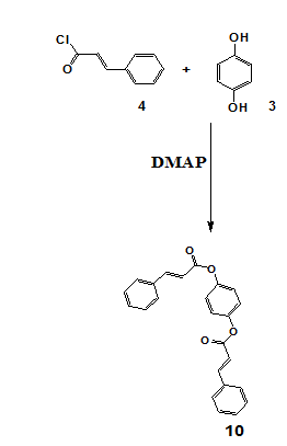 Scheme 7 and Scheme 8 detail the synthesis of compounds 9 and 10, respectively. Where Compounds 9 and 10 were synthesized via esterification of hydroquinone with cinnamoyl chloride in the presence of DMAP in an inert nitrogen atmosphere to prevent moisture-induced hydrolysis. The preparation of cinnamoyl chloride involved reacting cinnamic acid with thionyl chloride. For compound 9, hydroquinone was dissolved in dichloromethane, cooled, and cinnamoyl chloride was introduced dropwise in the presence of triethylamine and DMAP. The reaction mixture was stirred for 4 h, followed by purification through filtration, organic extraction, drying with magnesium sulfate, and TLC. The synthesis of compound 10 was carried out by heating cinnamyl chloride and hydroquinone in dichloromethane at 70 °C for 6 h with DMAP as a catalyst. The final product was purified through sequential washing, filtration, drying, monitored using thin-layer chromatography (TLC), and purified by column chromatography. Spectroscopic characterization was performed using NMR (¹H and ¹³C), FTIR, and HRMS, confirming the expected structures. Detailed spectral data are provided in the supplementary section.