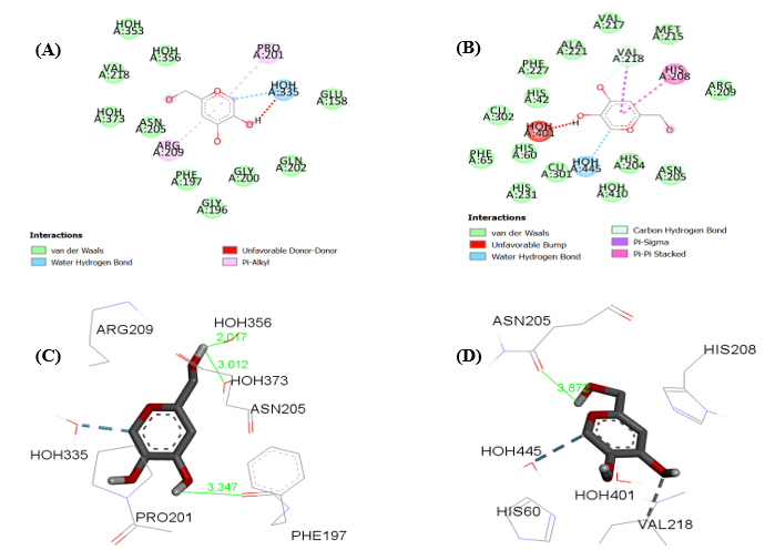 To assess the reliability and reproducibility of the docking protocols, the native co-crystallized ligands (KOJ1351 in 3NQ1 and KOJ303 in 5I38) were re-docked into their respective active sites using AutoDockVina (version 1.2.3). A grid box size of 22 Å × 22 Å × 22 Å was defined to encompass the entire catalytic pocket, and exhaustiveness was set to 8. The RMSD values between the re-docked and crystallographic poses were 1.20 Å for KOJ1351 and 0.97 Å for KOJ303, confirming accurate pose prediction within the accepted threshold of 2.0 Å (fig. 1E, 1F).