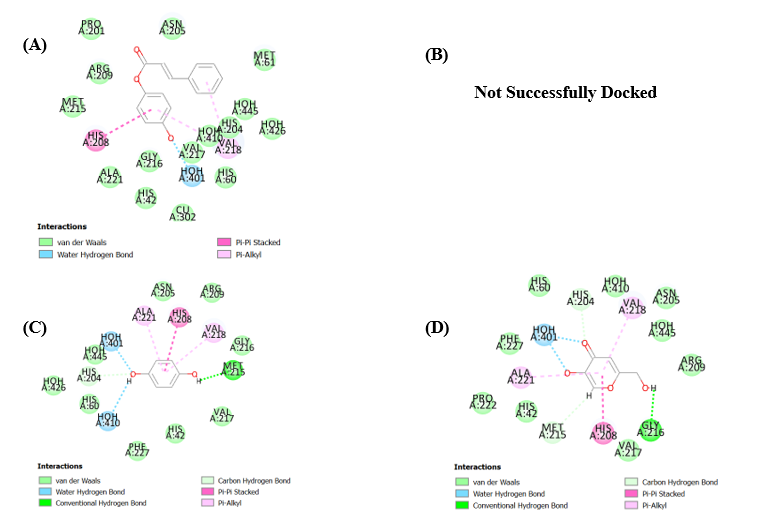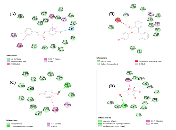 Binding interactions, including hydrogen bonding, hydrophobic interactions, and π-π stacking, were analyzed using Discovery Studio Visualizer and PyMOL software. The docking scores (binding energies) were recorded to compare the potential inhibitory activity of the synthesized compounds against tyrosinase. Results indicated that certain derivatives exhibited strong interactions with the catalytic residues of tyrosinase, suggesting their potential as effective inhibitors. Further validation through molecular dynamics simulations and free energy calculations may be required to confirm these findings.