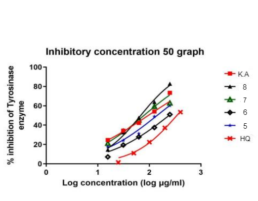 Fig. 6: The tyrosinase inhibition activity IC50 of synthesized compound 5,6,7,8,HQ,K. A