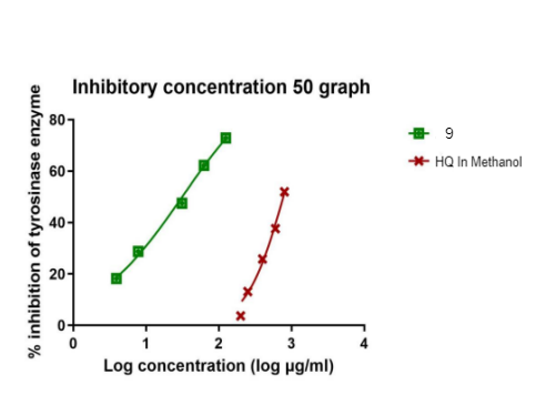 Fig. 7: The tyrosinase inhibition activity IC50 of synthesized compound 9, HQ in methanol