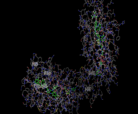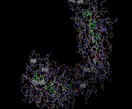 The three-dimensional molecular docking visualization offers key insights into the interaction between the target protein and synthesized ligands. The protein is shown in wireframe, revealing its coiled structure with alpha-helices and loops, while atoms follow standard color codes (e.g., blue for nitrogen, red for oxygen). The ligand-binding site is highlighted by green residues, notably aromatic ones like histidine, phenylalanine, and tryptophan, which suggest a predominantly hydrophobic and aromatic pocket. These residues facilitate π-π stacking and hydrophobic interactions, favoring ligands with aromatic or heteroaromatic features. Ligands 8 and 10 showed strong binding within a deep pocket, supported by docking scores and interaction data, with stabilization likely through π-π stacking and hydrogen bonding.