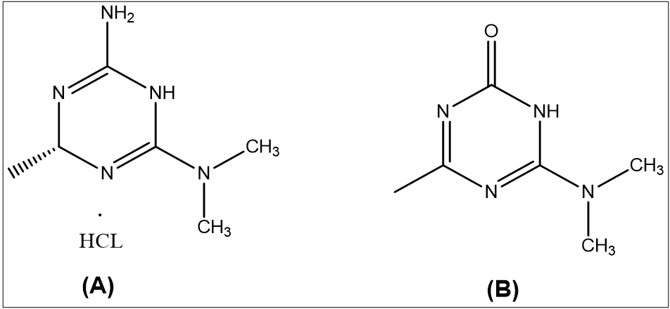 Fig. 1: Chemical structure of A. Imeglimin hydrochloride and B. Imeglimin ketone impurity