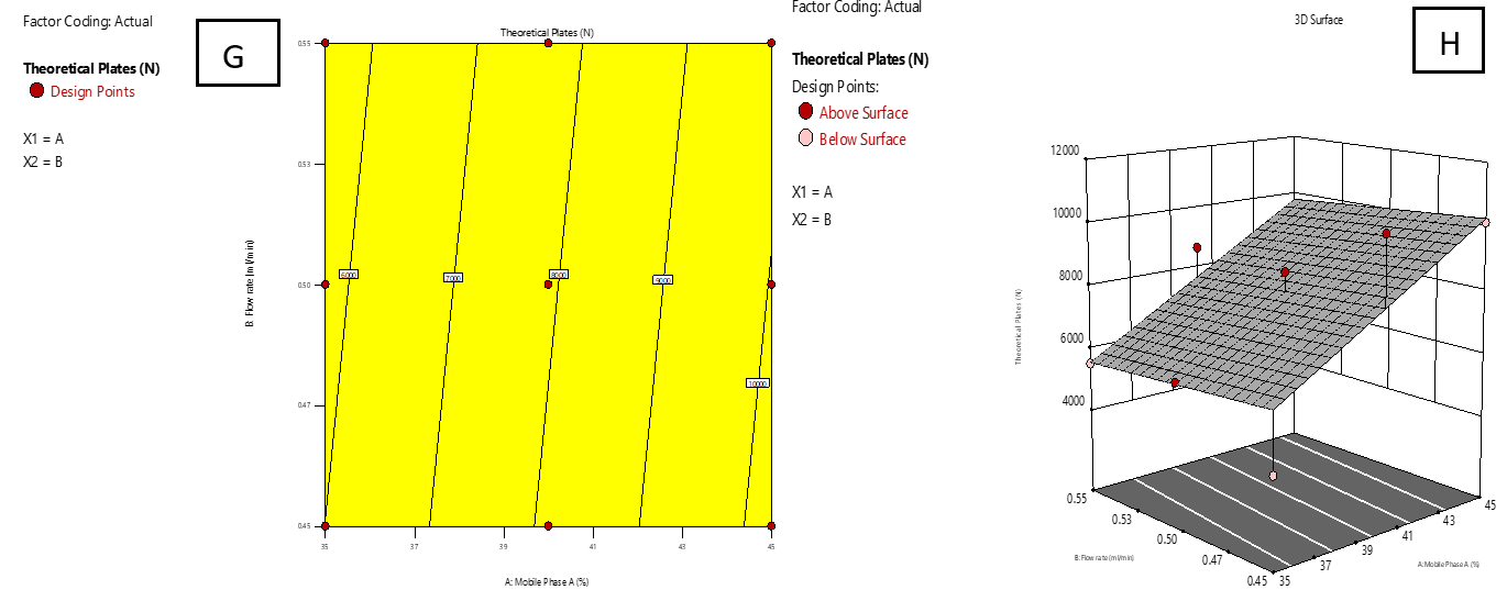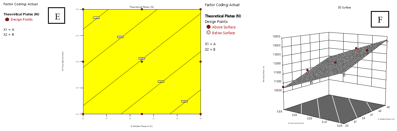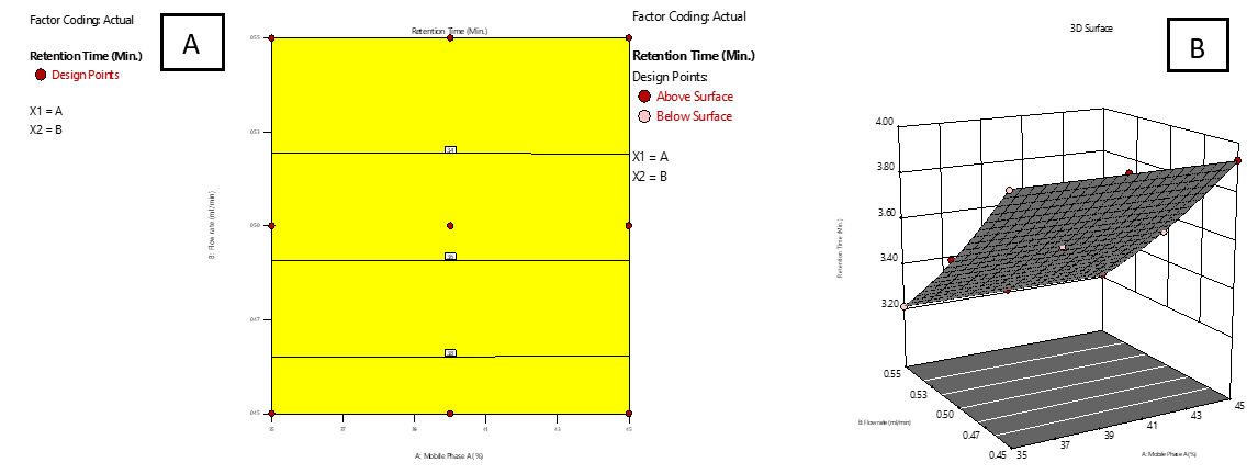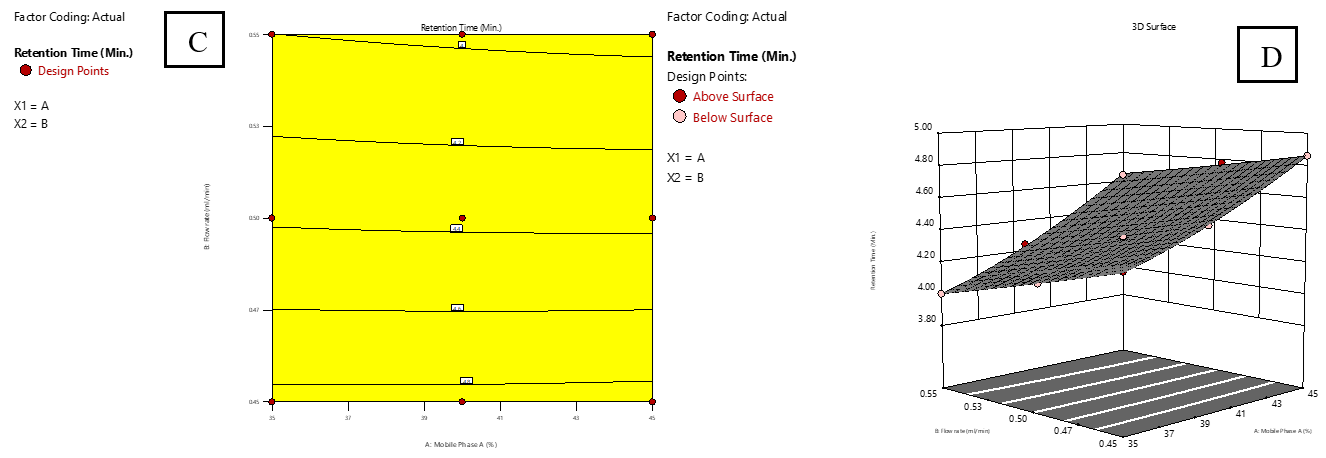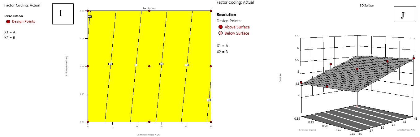 In this study, two essential factors were investigated at three levels: low (−1), medium (0), and high (+1). The first factor (A) represented the proportion of mobile phase A, set at 30%, 40%, and 50%, while the second factor (B) corresponded to FR, tested at 0.40, 0.50, and 0.60 ml/min. The response variables measured were RT of IMG (R1) and IKI (R2), TP for IMG (R3) and IKI (R4), and resolution (R5), as detailed in table 3. The collected data were analysed with Design-Expert software version 13.0. It was discovered that a quadratic response surface model fit best suited for R1 and R2, and a linear model provided a better fit for R3, R4, and R5. These models allowed for an efficient interpretation of how each response varied with variation in the experimental factors, ultimately guiding the optimization of chromatographic conditions for peak performance [22]. The appropriateness of these models was confirmed by testing their suitability through a series of statistical metrics, including the correlation coefficient, degrees of freedom (df), p-value, sum of squares, F-statistic, adjusted R², and predicted R². Response surface analysis was also performed, and both 2D contour and 3D response surface plots were constructed to illustrate the interaction effects between experimental factors and corresponding responses. Finally, optimal chromatographic conditions were determined by precisely adjusting numerical functions to obtain the desired effect, ensuring an efficient and well-optimised separation process.