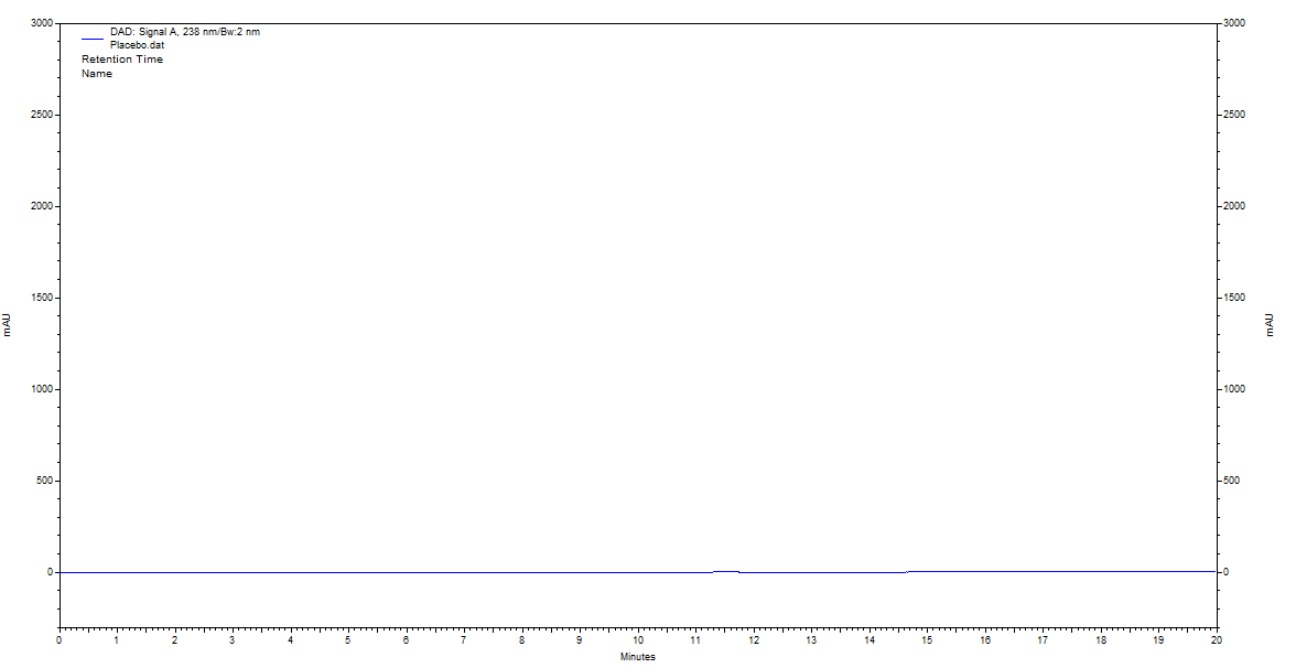 A homogeneous physical mixture of all excipients, such as microcrystalline cellulose, polyvinylpyrrolidone (PVP K-30), croscarmellose sodium, colloidal silicon dioxide, magnesium stearate, polyethylene glycol 400, titanium dioxide, and purified talc, was prepared by weighing 100 mg of each excipient and blending them thoroughly. An accurately weighed 10 mg portion of this mixture was transferred to a 100 ml volumetric flask. Approximately 70 ml of diluent was added, and the solution was ultrasonicated for 5 min to ensure complete dispersion. The volume was then made up to 100 ml with the same diluent, followed by thorough mixing to obtain a uniform placebo solution.