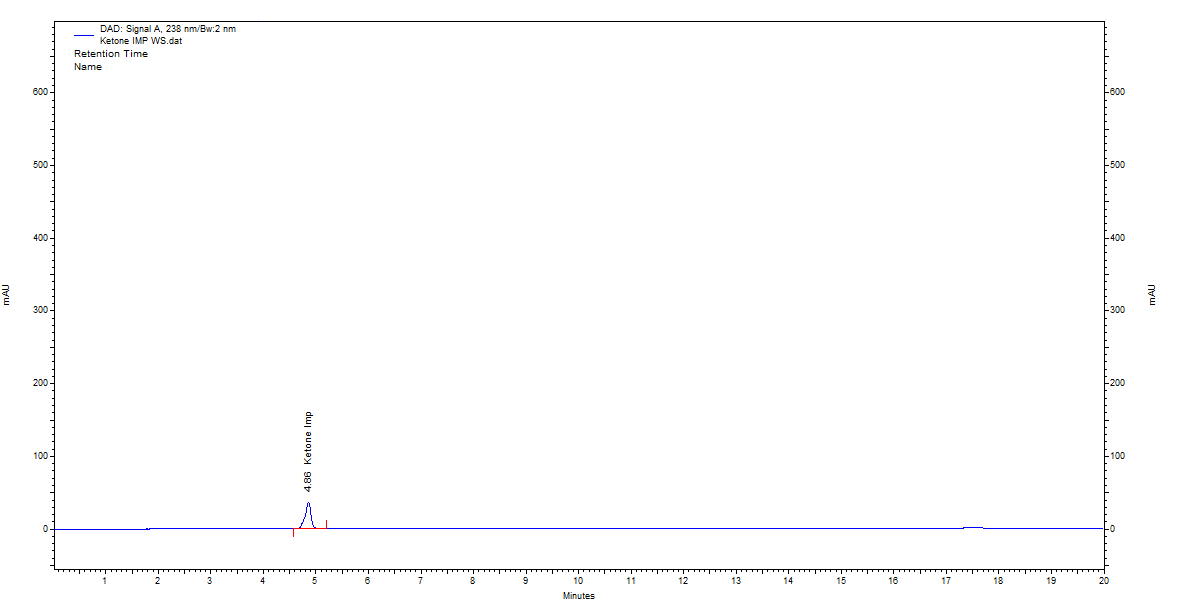 To address these issues, several method parameters were modified. The FR was reduced from 0.75 mL/min to 0.50 mL/min to improve resolution. The concentration of TFA was reduced from 0.1% to 0.01% to minimize peak broadening. The injection volume was also reduced from 50 µl to 10 µl to prevent column overloading. These modifications led to the optimization of the separation conditions, which were a 40:60 ratio of 0.01% TFA in water to ACN, an FR of 0.50 mL/min, an injection volume of 10 µl, and a detection wavelength of 238 nm. Under these conditions, the retention time was recorded at 3.51 min, the peak area was 12,076, and the peak purity index was 1.03. The detection of the ketone impurity was also greatly improved. Therefore, the proportion of MP-A and the FR were among the most critical factors in method development.