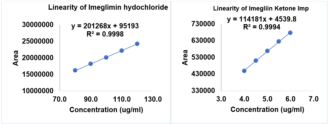 A robust, accurate, and precise QbD-based RP-HPLC method was successfully developed and optimised for the simultaneous estimation of IMG and IKI. CMPs were identified through risk assessment and optimised using DoE software, resulting in a method that demonstrated excellent linearity, accuracy, precision, and robustness within the studied range. The developed RP-HPLC method was successfully validated as per ICH Q2(R1) guidelines. Linearity was established over the concentration range of 80-120 ppm for IMG and 4–6 ppm for IKI, with R²of 0.9998 and 0.9994, respectively. Accuracy was demonstrated through recovery studies, with mean recoveries of 100.02–100.78% for IMG and 99.98–100.02% for the IKI, confirming the method reliability. The method showed good precision, with %RSD values well within acceptable limits (i. e., less than 2% as per ICH Q2(R1) guidelines). The LOD and LOQ were found to be 0.23 ppm and 0.70 ppm for the ketone impurity, indicating the method’s sensitivity. The method was also robust against small variations in analytical conditions. Therefore, this validated method is precise, accurate, and suitable for routine quality control of imeglimin and its related impurity in pharmaceutical formulations.