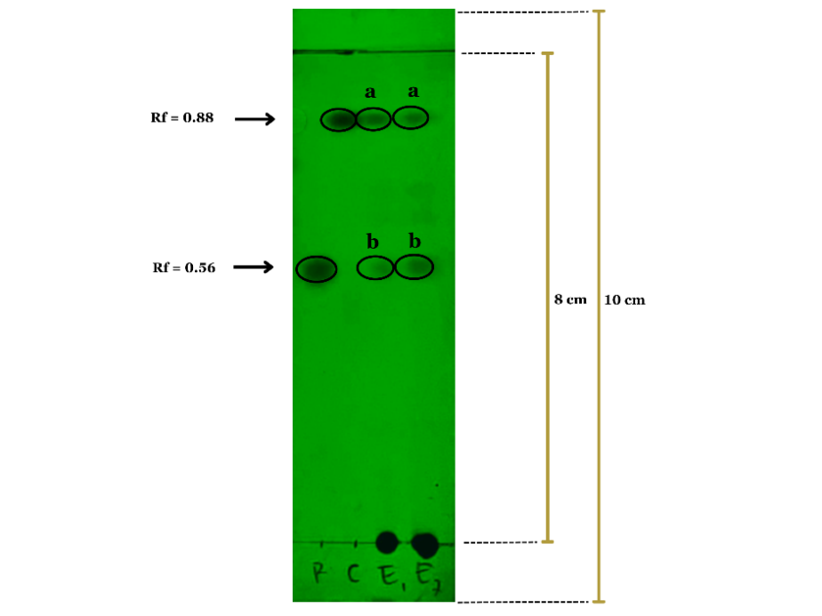 TLC analysis was performed to separate and identify the chemical constituents of the extract. The extract was dissolved in a suitable solvent and spotted onto a pre-coated silica gel TLC plate (60 F254, Merck). The plate was developed in a solvent system optimized for the target compounds (Chloroform: methanol: ethyl acetate: formic acid, 86: 6: 3: 5 v/v/v/v). After development, the plate was dried and visualized under ultraviolet (UV) light at 254 nm. The retention factor (Rf) values of the separated spots were calculated and compared with reference standards (Rubraxathon and cowanin) for identification [20].