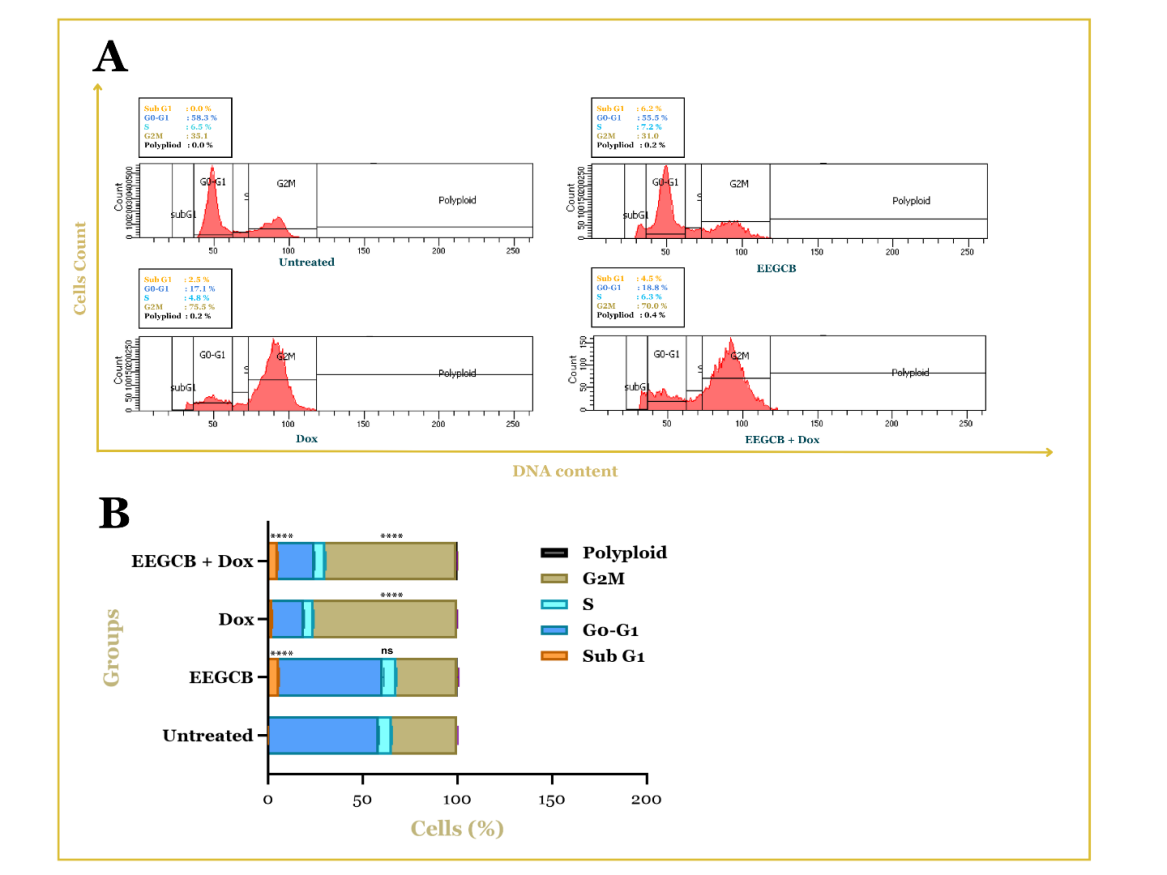 Fig. 2: Cell cycle distribution in T47D breast cancer cells analyzed by flow cytometry. (A) Representative histograms showing the distribution of cells in different phases of the cell cycle (SubG1, G0/G1, S, G2/M, and polyploid) after treatment with vehicle (Untreated), EEGCB, Dox, or the combination of EEGCB+Dox. (B) Quantification of cell cycle phase distribution, presented as the percentage of cells in each phase. Results are presented as mean±SD (n = 3). Ns: non-significant, **** p<0.0001 compared to the untreated group