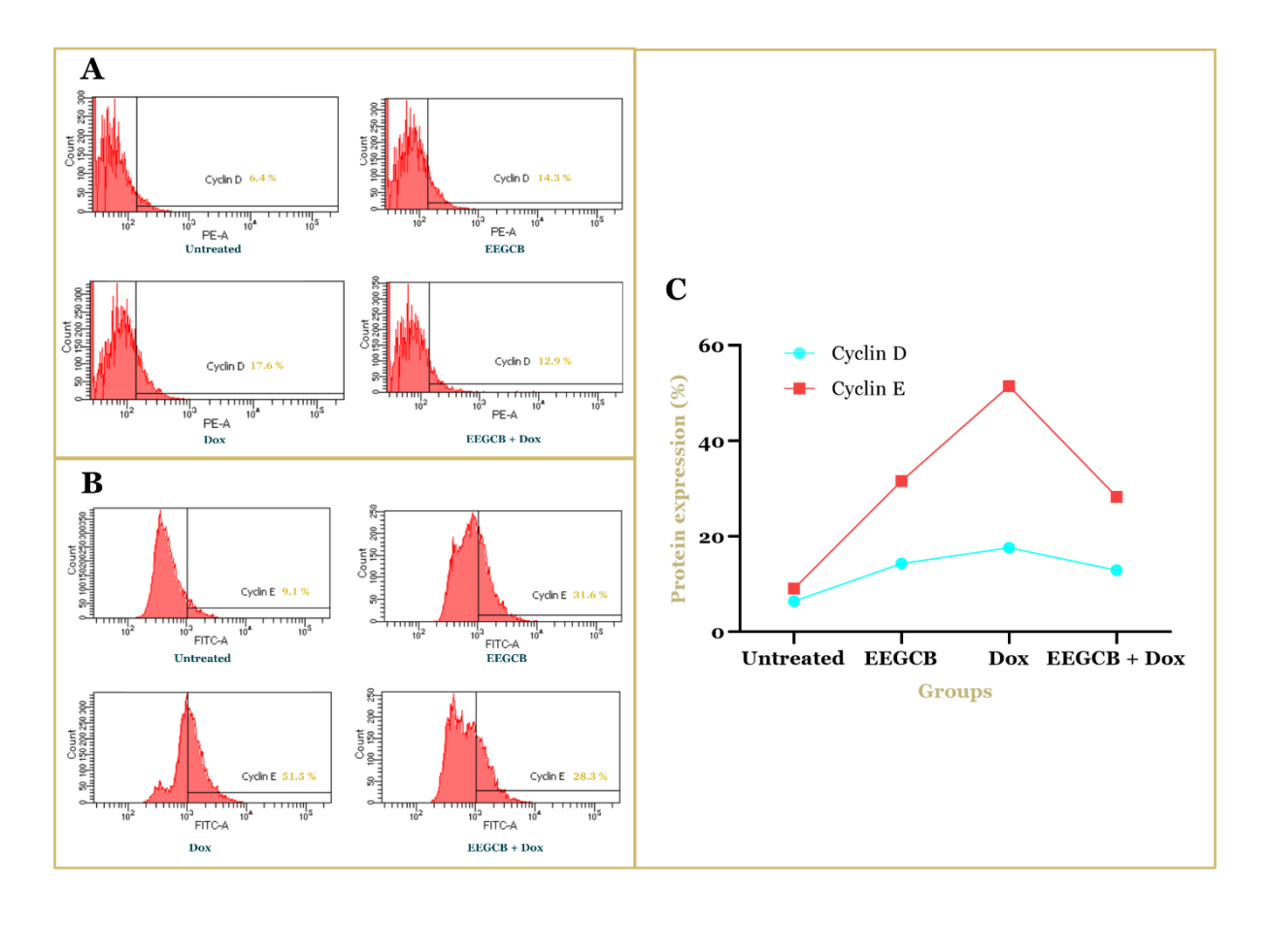 Fig. 3: Flow cytometric analysis of Cyclin D and Cyclin E protein expression in T47D breast cancer cells. (A) Representative histograms showing Cyclin D expression (PE-A channel). (B) Representative histograms showing Cyclin E expression (FITC-A channel). (C) Quantification of Cyclin D and Cyclin E protein expression, presented as the percentage of positive cells. Cells were treated with vehicle (Untreated), EEGCB (130 µg/ml), Dox (0.026 µg/ml), or the combination of EEGCB+Dox (130 µg/ml+0.026 µg/ml) for 48h