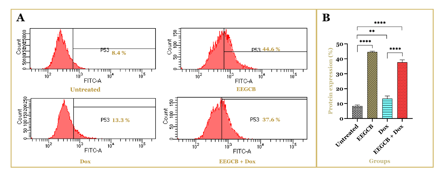 Fig. 4: Effect of EEGCB and Dox on p53 protein expression in T47D breast cancer cells. Flow cytometry analysis was performed to assess p53 protein expression in untreated cells, EEGCB-treated cells, Dox-treated cells, and cells treated with the combination of EEGCB and Dox. (A) The representative histograms illustrate the percentage of p53-positive cells in each treatment group. (B) The bar graph presents the quantification of p53 protein expression (%), showing a significant increase in the EEGCB and combination groups compared to untreated and Dox-treated cells (**p<0.01, ****p<0.0001). Data are presented as mean±SD (n = 3)