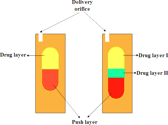 Fig. 1: Illustrates the OROS push-pull technology, showing the drug layers separated by a push layer. The delivery orifice releases the drug at controlled rates from both drug layers, offering both immediate and extended release characteristics.