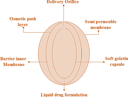 Fig. 2: Demonstrates the structure of L-OROS technology, highlighting the osmotic push layer, semi-permeable membrane, and the liquid drug formulation within a soft gelatin capsule. The system is designed to enable controlled drug release through the delivery orifice