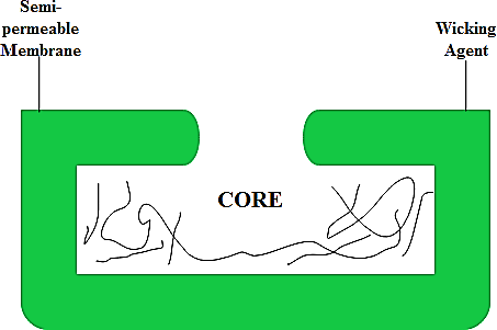 Fig. 3: Illustrates the EN-SO-TROL technology, showing the core surrounded by a semi-permeable membrane and a wicking agent. This system is designed to enhance drug delivery by utilizing the wicking agent to facilitate controlled release